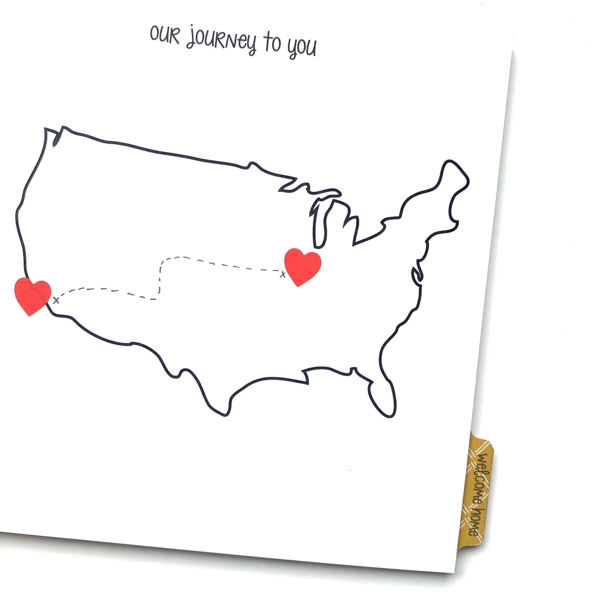 • map (either US or world) & two heart stickers to show the journey from you to your child
