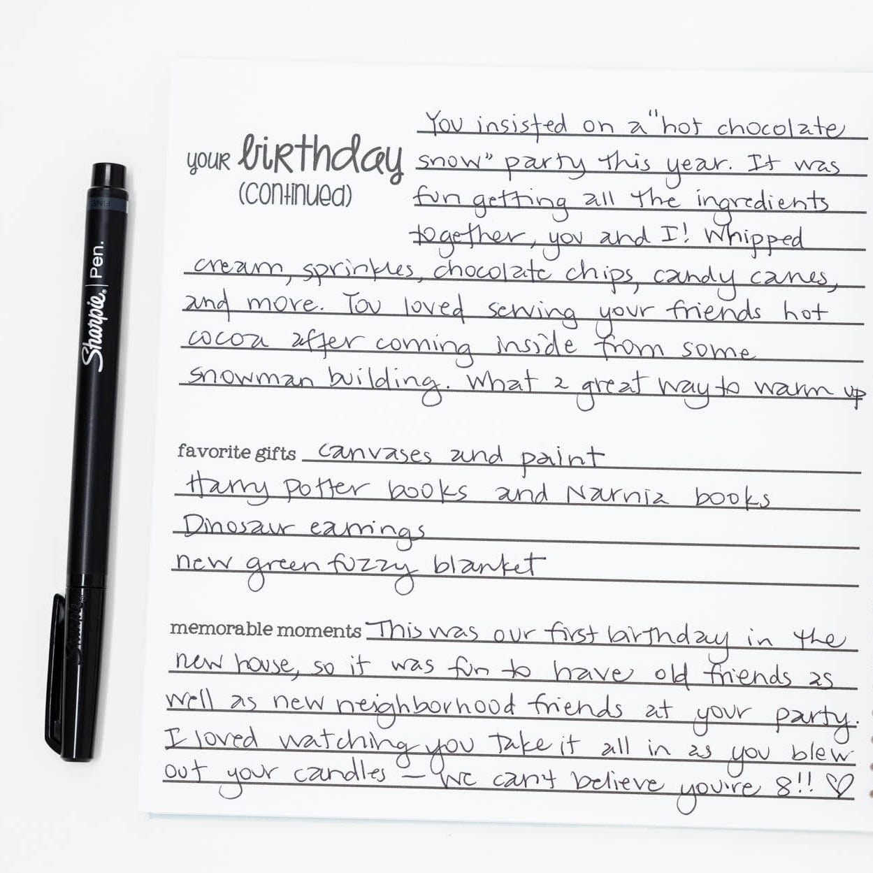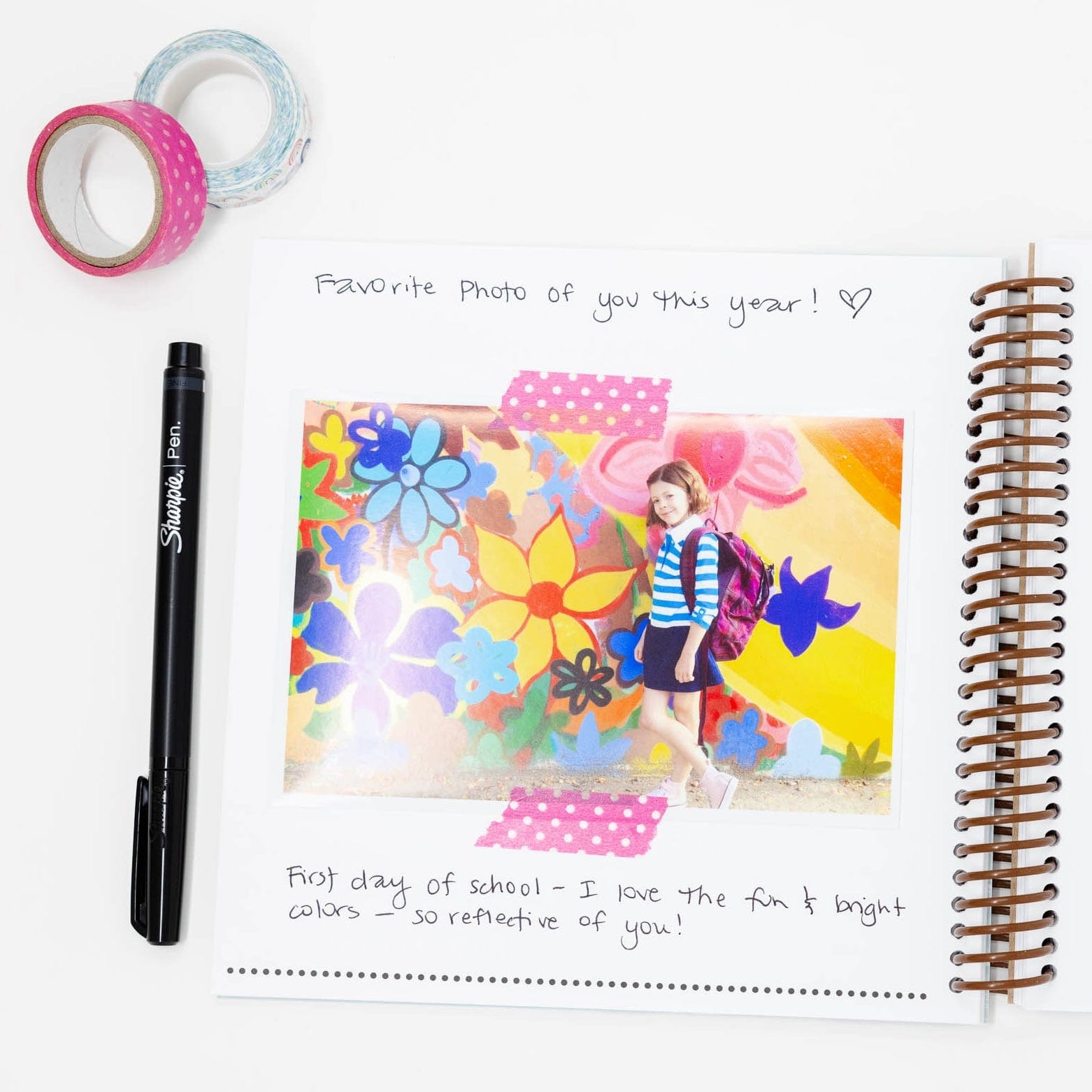 • An intentionally blank page you can use for whatever you'd like - a collage of photos from the year, additional birthday party photos, a space to write down the funny things your kids say during the year, a place to write your child a note each year or use it to ask your kids more questions than those included in the book.